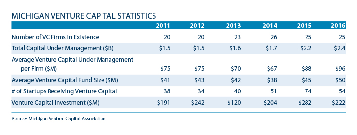 In 2016, 54 startups in Michigan received more than $222 million from Michigan venture capital firms, a 42-percent increase in the last five years and total venture capital under management in Michigan was $4 billion, an increase of over 30 percent. Additionally, the number of venture capital firms remained steady with 33 venture firms headquartered or with an office in Michigan.