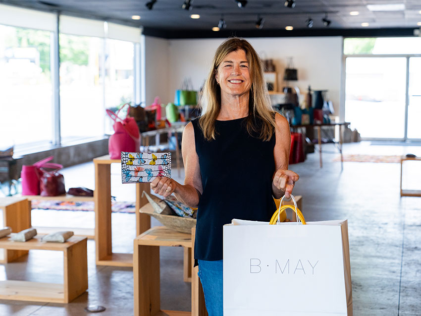 Perched in Petoskey, designer Barbara May brings her passion for fashion to the masses with B.May Bags. Barbara pursued a Fine Arts degree in woven textiles at Boston University, studying artistic mediums from furniture making and ceramics to jewelry and weaving. After living in New York City for years, she relocated home to Michigan and moved up north, where she has been making and selling her bags ever since. In 2023, Barbara presented at the Pitti Uomo menswear trade show in Italy, one of the largest in the world, with her unisex BM.AC bag collaboration with designer Aki Choklat. The designers attended as part of a collective of Metro Detroit-area designers called Detroitissimi. The collective’s participation in Pitti Uomo was supported in part by the MEDC’s International Trade team, providing the designers with unmatched exposure in the industry.