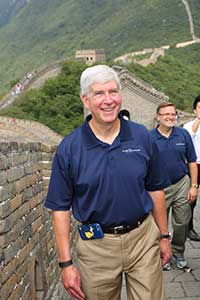 LANSING, Mich. – Gov. Rick Snyder kicked off the first full day of his fifth investment mission to China with a walk on the Great Wall at Mutianyu, visiting one of the country’s most famed, historic sites to talk about shared cultural and travel attractions and promote opportunities for Chinese tourists in ‘Pure Michigan.’