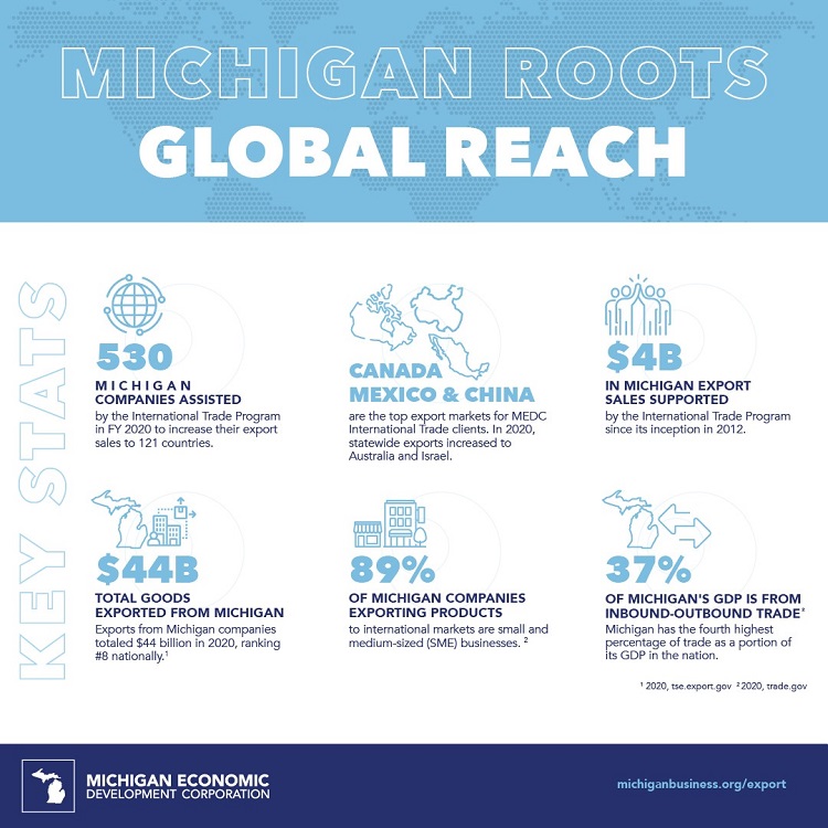 To learn more about how MEDC’s International Trade Program can help you grow your business into new markets, please visit michiganbusiness.org/export.