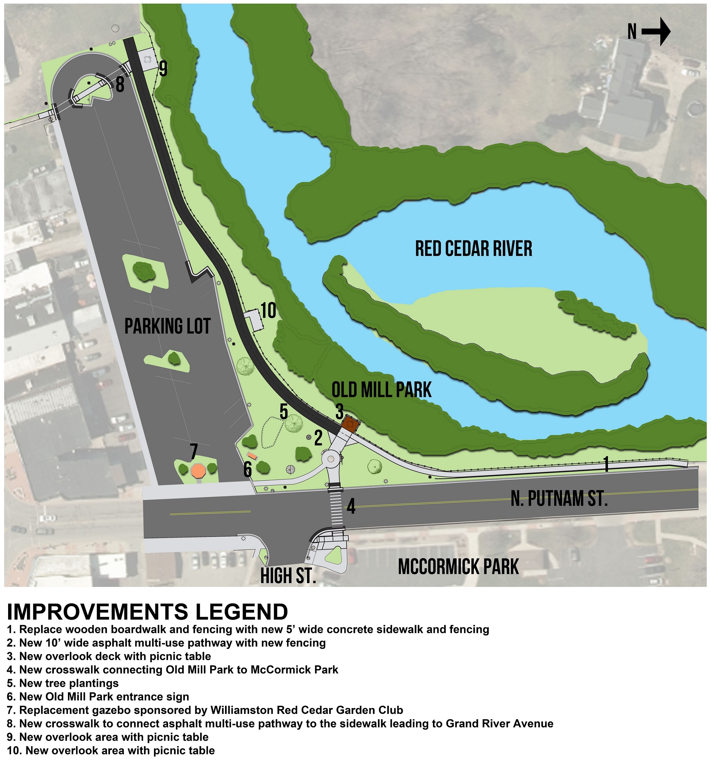 This project will activate an underutilized area of downtown Williamston along the Red Cedar River and provide a critical link between two sides of the downtown district for pedestrians to enjoy. The City of Williamston Downtown Development Authority has been leading this revitalization effort at Old Mill Park which includes the replacement of the boardwalk with a new accessible pathway along the Red Cedar River, installation of three overlook areas with picnic tables, a connection to McCormick Park with a new crosswalk, the replacement of the current gazebo with a new wheelchair accessible gazebo, and site amenities including new trees and seating areas. This project will be a part of a major improvement project that will create wonderful recreation spaces in downtown Williamston.