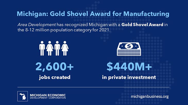 Michigan receives 2021 Manufacturing Gold Shovel Award on strength of 2,619 new jobs and $441.8 million in private investment
