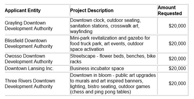 “Thriving, attractive downtowns are vital to creating unique places where people want to live, work, visit and play,” said Governor Gretchen Whitmer. “With today’s grants, these communities are taking important steps toward strengthening their core commercial districts and driving economic growth in the community. As we jumpstart our economy and begin a quintessential Michigan summer, I am excited for vibrant downtown areas to be full of life once again.”