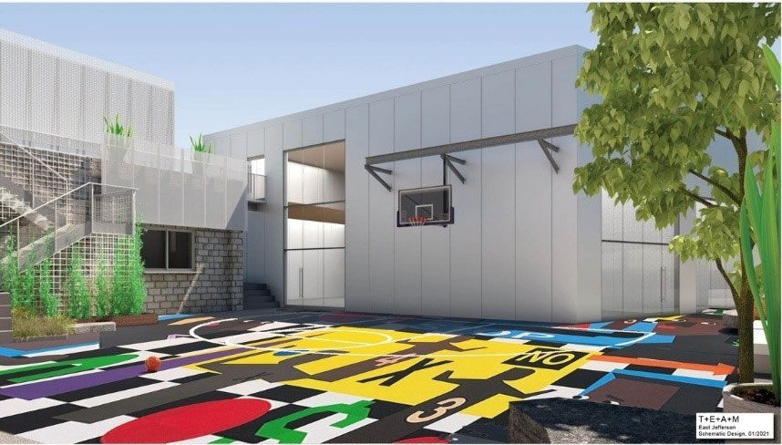 The Jefferson Holcomb project will include the construction of a new two-story mixed-use building, rehabilitation of an existing building, and creation of a community gathering space at the corner of East Jefferson and Holcomb Streets in the East Village neighborhood of Detroit. The new building will include four retail suites including mezzanine space with one suite to be occupied by a minority-owned entrepreneurial clothing and lifestyle store. The existing commercial storefront will be renovated into a café with additional deck space, and the new outdoor courtyard space will be accessible to the public and will include arts and cultural programming, an enclosed, open-air basketball court and rooftop deck space.