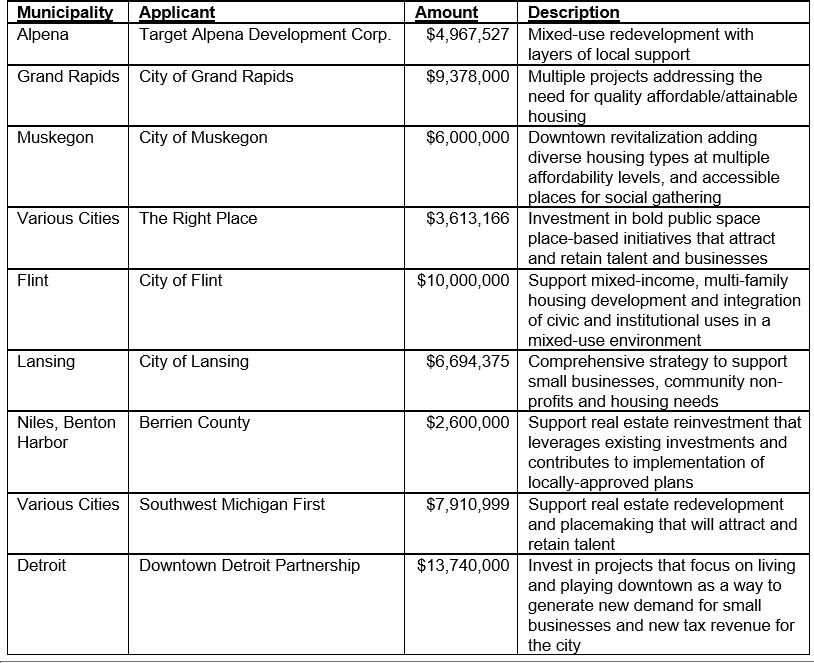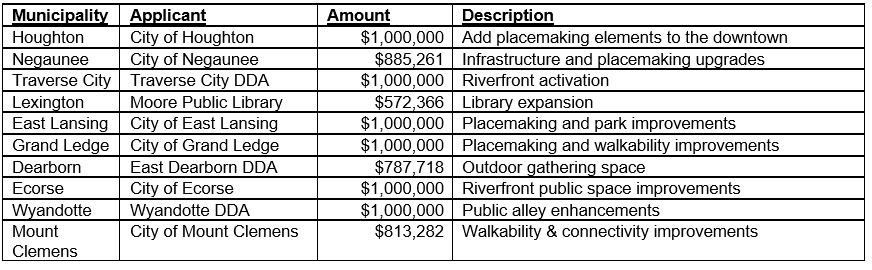 - Public Space Place-Based RAP Awards – $9,058,627 awarded to 10 communities around Michigan for infrastructure improvements, public facility enhancements, affordable housing, downtown improvements, and more;