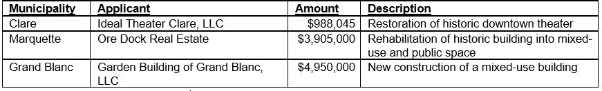 - Real Estate Rehabilitation RAP Awards – $9,843,045 awarded to mixed-use development projects in Clare, Marquette, and Grand Blanc;