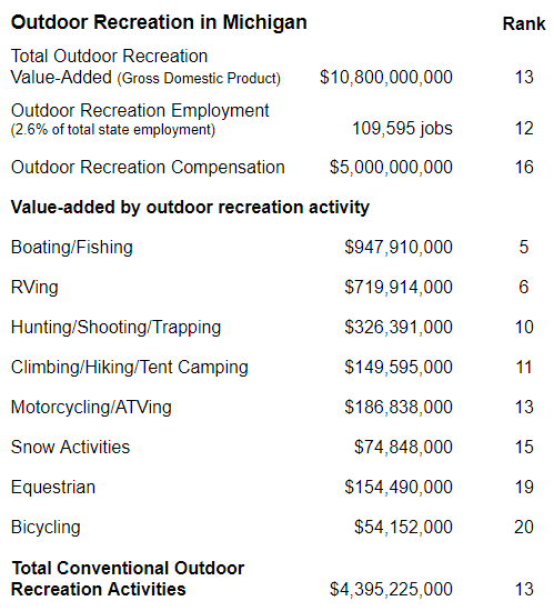 This is the largest recorded measure for Michigan since the BEA started calculating the size of the outdoor recreation economy in 2012.