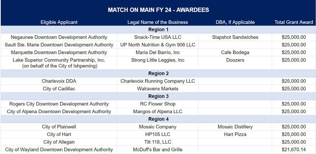 “Match on Main is an important tool for place-based small businesses and communities across Michigan and serves as a catalyst in driving small business investment and growth opportunities,” said Amy Rencher, Senior Vice President of Small Business Services at MEDC. “Through the Match on Main Program, we’re not just investing in small businesses; we’re revitalizing communities and fostering economic growth one entrepreneur at a time.”