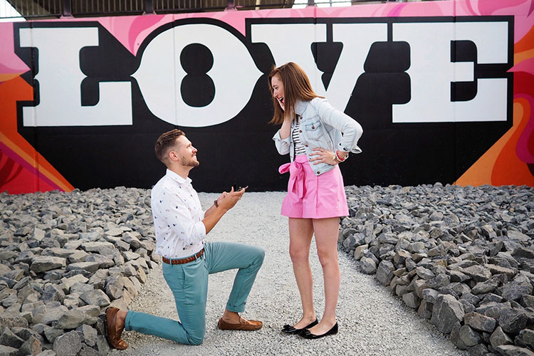 When Clay knew he wanted to propose to Leslie in September 2017, he couldn’t think of a better way than to do it than in front of a mural. He planned a trip to Boston and proposed in front of a mural that said, “LOVE.”