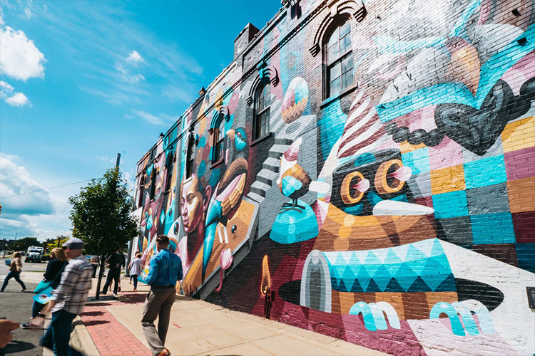 Throughout the years of the festival, Clay and the Bright Walls team focused on curating a diverse artist roster. The 75 murals on buildings throughout downtown Jackson were painted by artists from countries across the globe, including Australia, Belarus, Brazil, Canada, England, France, Greece, Italy, Mexico, The Netherlands, Puerto Rico, South Africa, and the United States. Artists from around the U.S. represent California, Colorado, Florida, Indiana, New York, Oregon, Pennsylvania, South Carolina, Texas and, of course, Michigan. Featured Michigan artists traveled to Jackson from Detroit, Fennville, Flint, Grand Rapids, Jackson, Lansing, Oak Park and South Haven.